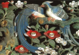 金沢の兼六園にある成巽閣成巽閣(せいそんかく)。その謁見の間の欄間は岩絵の具で極彩色に彩られた花鳥がモチーフで、赤い花は椿です。