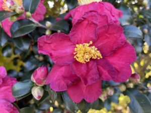 鮮やかな濃紅色の肥後サザンカ「夕陽(せきよう)」