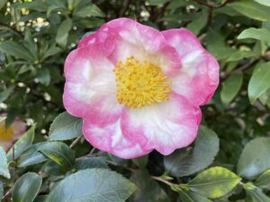 近所の駐車場の入り口を彩るサザンカ 。10月頃からぽつりぽつりと咲き始めています。大ぶりの丸い花弁は鮮やかな濃桃紅色に縁取られ、通る人の目を引き留めます。