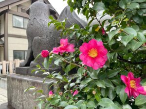 神社を守る狛犬を後ろで応援するサザンカ 、といったところでしょうか。