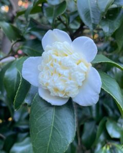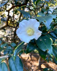 ごく淡い桃色地にほんのり桃色のぼかしが入った「初雁」。一重の筒咲き、あるいはラッパ咲きの小輪。「昭和侘助」の別名もあります。かつては数寄屋と呼ばれた事もありますが今は別種と区別されています。細長く伸びた葉が目立ちますね。