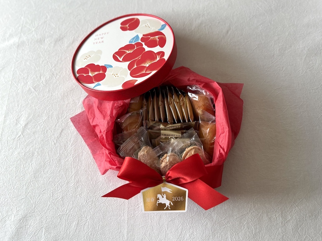 パッケージは赤い椿の花を散りばめた丸い箱に赤い大きめリボンが架けられた華麗なデザイン。リボンの中心にはブランドマークである旗を掲げて馬に乗る人物のシルエットのタグが添えてあります。お正月用パッケージは他に四角い箱のS、LサイズとアソートB O Xがありますが、やはり丸箱デザインに心惹かれます。