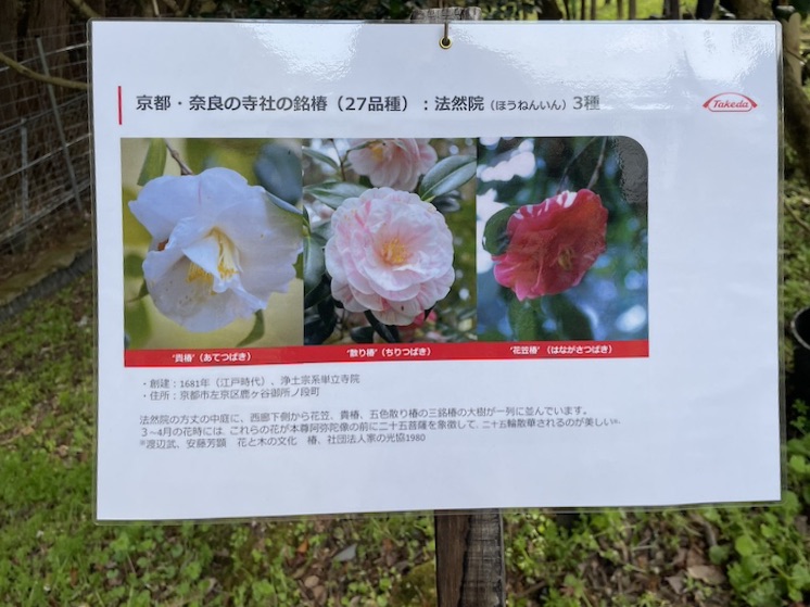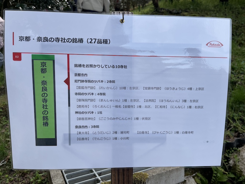 案内板によると銘椿を預かる寺社は京都7ヶ所、奈良3ヶ所の合計10ヶ所。品種数は27品種で、うち2種類はバックヤードで保存されています。